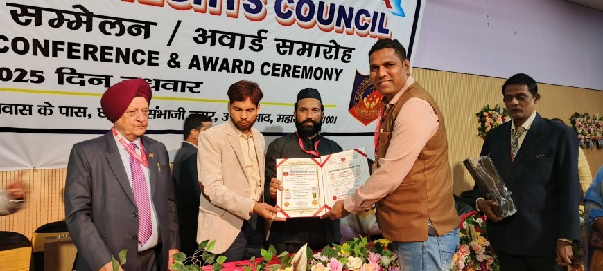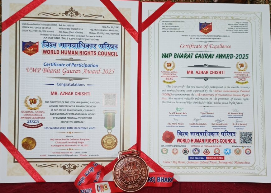 छत्रपती संभाजीनगर (औरंगाबाद) चिश्ती अज़हरुद्दीन को राष्ट्रीय स्तर पर ‘भारत गौरव अवॉर्ड 2025’ से सम्मान विश्व मानवाधिकार परिषद द्वारा चिश्ती अज़हर को “VMP भारत गौरव अवॉर्ड–2025” से सम्मानित किया गया छत्रपती संभाजीनगर के हज हाउस में आयोजित विश्व मानवाधिकार परिषद (World Human Rights Council – WHRC) की 10वीं नेशनल एनुअल कॉन्फ्रेंस एवं अवॉर्ड सेरेमनी 2025 में शहर के जाने-माने पत्रकार और समाजसेवी चिश्ती अज़हरुद्दीन (Editor-in-Chief, Daily Newspaper Cosmo Express) को “VMP भारत गौरव अवॉर्ड–2025” से सम्मानित किया गया। कार्यक्रम में उन्हें Certificate of Excellence, Certificate of Participation तथा आधिकारिक अवार्ड मेडल प्रदान किया गया। कार्यक्रम में कई प्रमुख मीडिया प्रतिनिधि एवं संपादक भी उपस्थित रहे, जिनमें शामिल थे Mr. Shoheb Qhusro, Editor-in-Chief, Daily Newspaper, Mr. Shaikh Zafar, Senior Crime Reporter, Dainik Bhaskar. M.A. Shakeel Editor-in-Chief Weekly Newspaper The Rimix, Mr. Imran Bahashwan Editor-in-Chief Daily Newspaper Aaj Ki Awaz. Mr.Feroz Khan national president minority front and Shaikh Ghani Editor-in-Chief Daily Newspaper. तथा कई अन्य वरिष्ठ पत्रकार एवं मीडिया प्रतिनिधि। इसके साथ ही, कार्यक्रम में दामिनी पथक की टीम तथा शहर की लेडीज़ पुलिस महिला कर्मियों को भी समाज में महिला सुरक्षा, कानून व्यवस्था और जनसेवा के क्षेत्र में उनके उत्कृष्ट योगदान के लिए सम्मानित किया गया। परिषद ने महिला सुरक्षा के लिए किए जा रहे उनके प्रयासों की भूरी-भूरी प्रशंसा की।कार्यक्रम में देश की रक्षा में सदैव तत्पर रहने वाले भारत के सेना के जाँबाज़ जवानों को भी सम्मानित किया गया। कार्यक्रम में देश की रक्षा में सदैव तत्पर रहने वाले भारत के सेना के जाँबाज़ जवानों को भी सम्मानित किया गया। परिषद ने राष्ट्र की सुरक्षा में उनके अदम्य साहस और समर्पण की सराहना करते हुए उन्हें विशेष श्रद्धांजलि और सम्मान अर्पित किया। कार्यक्रम के दौरान परिषद के संस्थापक अध्यक्ष अधिवक्ता एम. आर. अंसारी सहित कई पदाधिकारियों ने चिश्ती अज़हर के समाजसेवा एवं मानवाधिकार जागरूकता के निरंतर कार्यों की सराहना करते हुए उन्हें युवाओं के लिए प्रेरणादायी बताया। सम्मान प्राप्त करने के पश्चात चिश्ती अज़हरुद्दीन ने कहा— “यह सम्मान मेरे लिए गर्व का विषय है। यह मुझे समाज सेवा और मानवाधिकारों की सुरक्षा के लिए और अधिक प्रतिबद्ध होकर कार्य करने की प्रेरणा देता है।” कार्यक्रम का समापन मानवाधिकार संरक्षण, महिला सुरक्षा और सामाजिक न्याय के क्षेत्र में कार्यरत सभी प्रतिनिधियों के सम्मान के साथ हुआ।