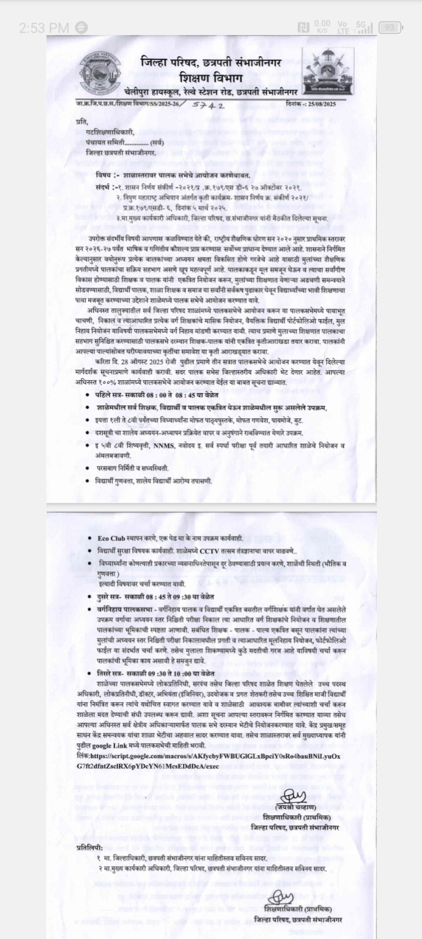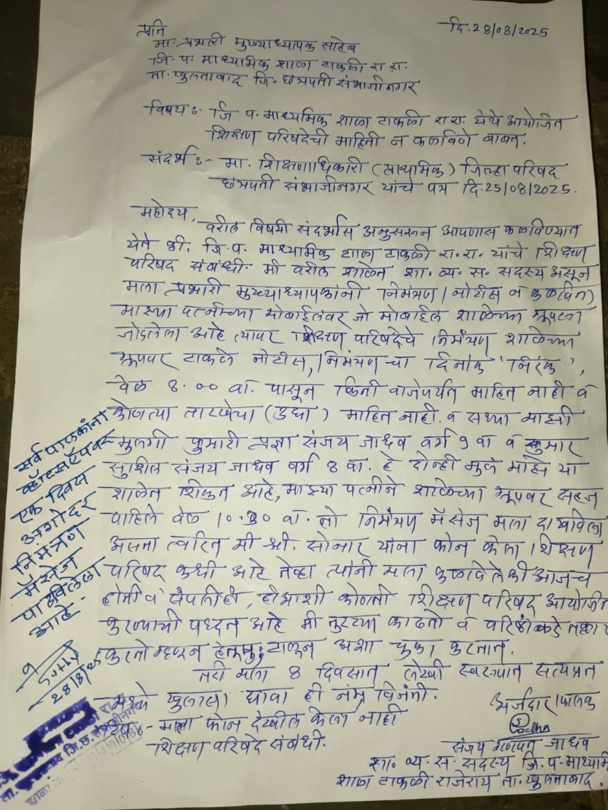 ???? टाकळी राजेराय शाळेत प्रभारी मुख्याध्यापकांचा मनमानी कारभार? खुलताबाद तालुक्यातील जि.प. माध्यमिक शाळा, टाकळी राजेराय येथे प्रभारी मुख्याध्यापकांविरोधात शालेय व्यवस्थापन समिती सदस्य संजय जाधव यांनी लेखी तक्रार दाखल केली आहे. जिल्हाधिकारी व शिक्षणाधिकारी यांच्या आदेशानुसार दि.२८ ऑगस्ट रोजी विशेष पालक सभा घेणे बंधनकारक होते, मात्र प्रभारी मुख्याध्यापकांनी आदेशांचे पालन न करता बिना तारखेची नोटीस व्हॉट्सॲपवर पाठवून काही निवडक पालकांना बोलावून सभा उरकून घेतली असल्याचा आरोप आहे. सभेत दशसूत्री गुणवत्ता वाढ उपक्रम राबवला गेला नाही तसेच शाळेत नियमित तासिका देखील होत नसल्याचे आढळून आले. मागील वर्षीच्या एनएमएमएस शिष्यवृत्ती परीक्षेत शाळेचा निकाल शून्य टक्के लागल्याने पालक व ग्रामस्थांमध्ये नाराजीचे वातावरण आहे. प्रभारी मुख्याध्यापक गेली तब्बल ३२ वर्षे त्याच शाळेत कार्यरत असून त्यांच्या कारभारात शिथिलता आल्याचा आरोप करण्यात आला आहे. त्यामुळे प्रभारी मुख्याध्यापकांवर तात्काळ कारवाई करून बदली करण्यात यावी व शाळेकडे विशेष लक्ष द्यावे, अशी मागणी शा.व्य.स. सदस्य संजय जाधव यांनी केली आहे.