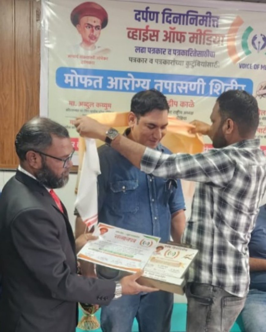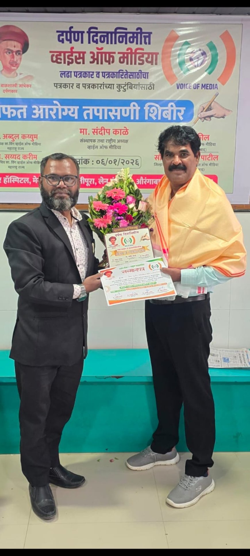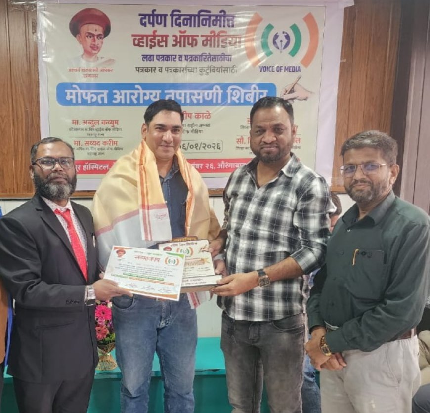 निर्भीक पत्रकारिता से ही लोकतंत्र सशक्त होता है – मकसूद अंसारी दर्पण दिवस के अवसर पर ‘वॉइस ऑफ मीडिया’ की ओर से शहर के पत्रकारों का सम्मान छत्रपति संभाजीनगर : समाज को सही दिशा देने का पवित्र कार्य पत्रकार करते हैं और निर्भीक, ईमानदार व जिम्मेदार पत्रकारिता से ही लोकतंत्र अधिक मजबूत होता है। यह प्रतिपादन गब्बर एक्शन संगठन के अध्यक्ष मकसूद अंसारी ने किया। दर्पण दिवस के अवसर पर ‘वॉइस ऑफ मीडिया’ संगठन की ओर से शहर के विभिन्न समाचार पत्रों में कार्यरत पत्रकारों के सम्मान हेतु मोमेंटो व प्रमाण-पत्र प्रदान कर सम्मान समारोह का आयोजन किया गया। इस कार्यक्रम की अध्यक्षता मकसूद अंसारी ने की। इस अवसर पर ‘वॉइस ऑफ मीडिया’ के प्रदेशाध्यक्ष अब्दुल कय्यूम तथा जिलाध्यक्ष डॉ. शेख शकील प्रमुख अतिथि के रूप में उपस्थित थे। उनके हाथों पत्रकारों को प्रमाण-पत्र देकर सम्मानित किया गया। इस सम्मान समारोह में श्री चिश्ती अज़हरुद्दीन हसीबुद्दीन मुख्य संपादक, कॉस्मो एक्सप्रेस दैनिक समाचार पत्र दैनिक पुण्यनगरी के वरिष्ठ पत्रकार परवेज खान, MCN समाचार के सैयद इम्तियाज, एडवोकेट सैयद मोईन, एडवोकेट सज्जाद नवाब पटेल, दैनिक भास्कर के शेख राजू, उज्ज्वल महाराष्ट्र के संपादक हसन शाह, दैनिक लोकमत के शेख मुनीर, डॉ. शेख अफसर, दैनिक शब्दमत के संपादक अजमत खान पठाण, काज़ी नजमुद्दीन, एम. ए. शकील (मुख्य संपादक, साप्ताहिक रिमिक्स समाचार पत्र), अनिस रामपुरे, सैयद सादिक अली, सैयद एहतिशाम, नेहा खान, अब्दुल वाहिद, , कलीम चिश्ती सहित अनेक वरिष्ठ पत्रकारों का सम्मान किया गया। अध्यक्षीय भाषण में मकसूद अंसारी ने कहा, “पत्रकारिता लोकतंत्र का चौथा स्तंभ है। आम नागरिकों की आवाज़ को शासन तक पहुँचाने का कार्य पत्रकार करते हैं। इसलिए किसी भी दबाव में आए बिना सत्य और न्याय के लिए लेखनी चलाना ही सच्ची पत्रकारिता है।” कार्यक्रम के सफल आयोजन के लिए ‘वॉइस ऑफ मीडिया’ के सभी पदाधिकारियों ने विशेष परिश्रम किए। इस सम्मान समारोह से शहर के पत्रकारों में संतोष और उत्साह का वातावरण देखने को मिला।